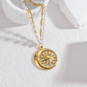 Double-Layer Layered Pearl Necklace, Sun Design