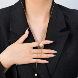 Long Stainless Steel Necklace with Stainless Steel Ring and Large Pearl Pendant (Sweater Chain)