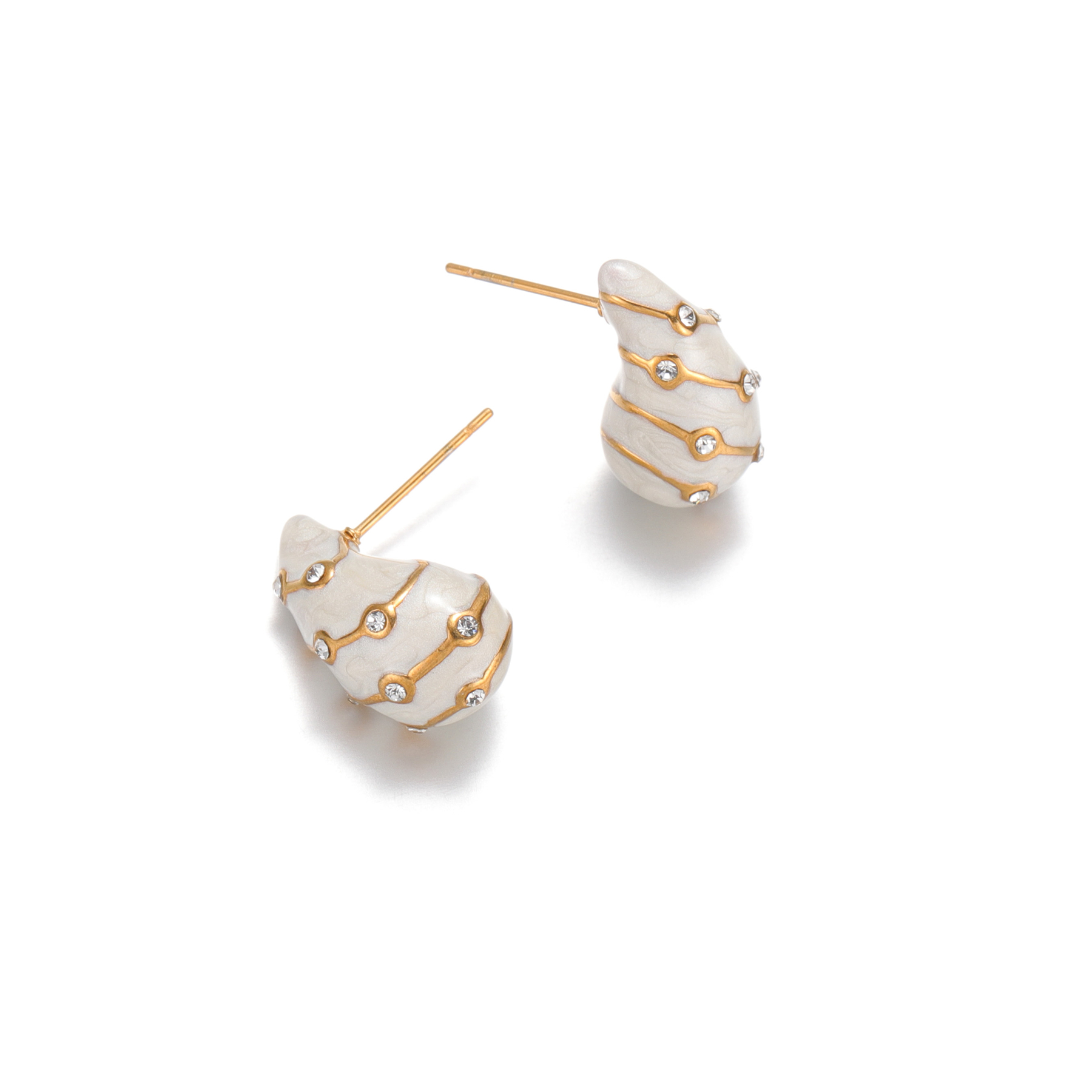 Water Drop-shaped Enamel and Diamond-Embedded Earrings, White