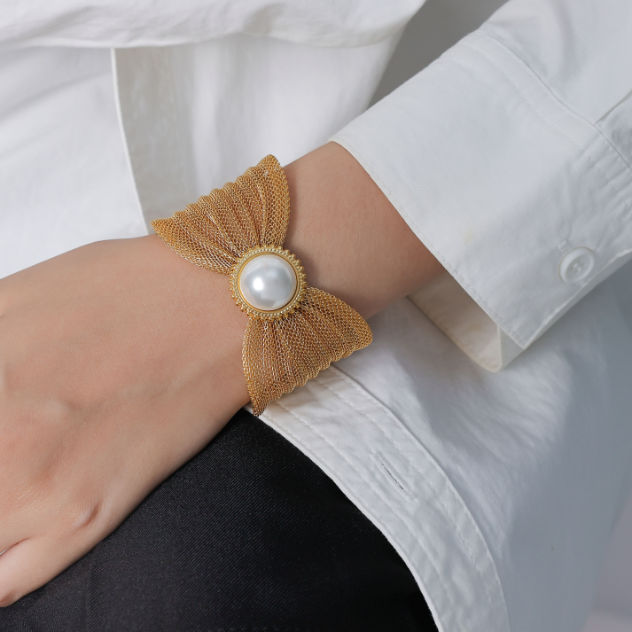 Wide and Stylish Stainless Steel Pearl Bracelet with a Grand Aesthetic