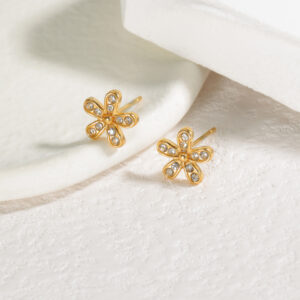 Simple Diamond-Embedded Flower Stud Earrings, Gold, Multi-Diamond Style