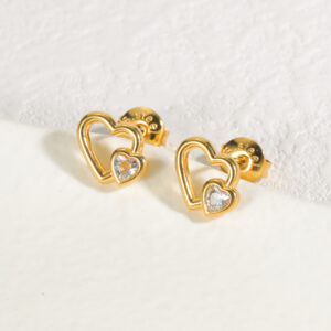 Simple Diamond-Embedded Heart Stud Earrings, Gold, Heart-to-Heart Design