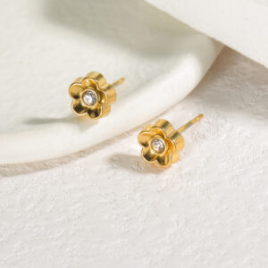 Simple Diamond-Embedded Flower Stud Earrings, Gold, Single-Diamond Style